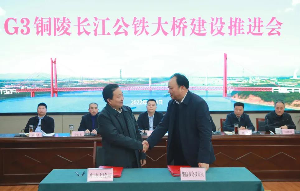 會(huì)上,中鐵大橋局與銅陵市交投集團(tuán)舉行了G3銅陵長(zhǎng)江公鐵大橋施工合同簽約儀式。
