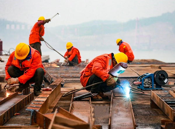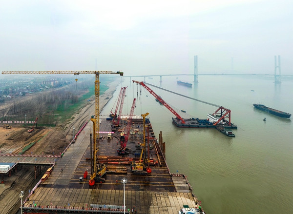 4日上午8時30分,位于長江北岸G3銅陵長江公鐵大橋3號墩的施工現(xiàn)場,上百名橋梁建設(shè)者正在進行施工平臺的鋪設(shè)和完善,以及鋼護筒的插打作業(yè)?,F(xiàn)場塔吊林立,焊花四濺,一派繁忙的景象。中鐵大橋局G3銅陵長江公鐵大橋項目部一分部黨支部書記趙懿告訴記者,目前大型吊船、履帶吊、塔吊、旋挖鉆機等大型設(shè)備已經(jīng)到位,“2022年,我們計劃實施橋墩鉆孔樁、承臺、墩身等施工,年度計劃投資10億多元?!?