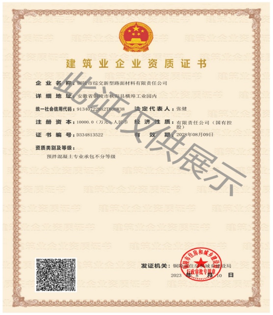 2023年8月,綜交新材料公司順利獲得建筑業(yè)企業(yè)預拌混凝土資質證書,該項資質的取得,標志著綜交新材料公司在行業(yè)內的重大突破,進一步提升了在建筑行業(yè)內的業(yè)務拓展能力和市場競爭力,更好地服務于G3銅陵長江公鐵大橋、G330一級公路改擴建工程、江北港鐵路專用線及江北新區(qū)發(fā)展等重點項目的建設,同時為綜交新材料公司在樅陽縣域混凝土市場上站穩(wěn)腳跟奠定堅實基礎。