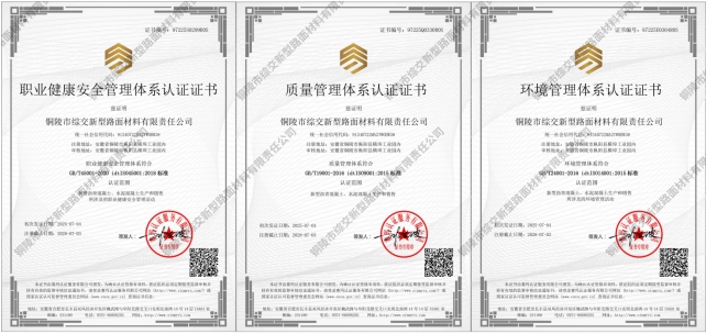 近日,綜交新型路面材料公司順利取得ISO“三體系”(ISO9001質(zhì)量管理體系、ISO14001環(huán)境管理體系、ISO45001職業(yè)健康安全管理體系)認(rèn)證證書(shū),這是我司在提升企業(yè)綜合實(shí)力過(guò)程中取得的新進(jìn)展,標(biāo)志著我司在精細(xì)化、制度化、規(guī)范化管理方面邁上了新臺(tái)階。