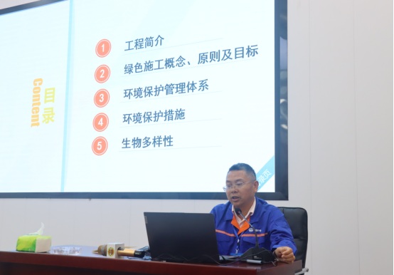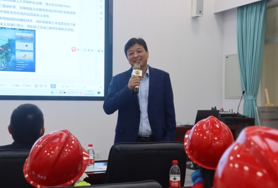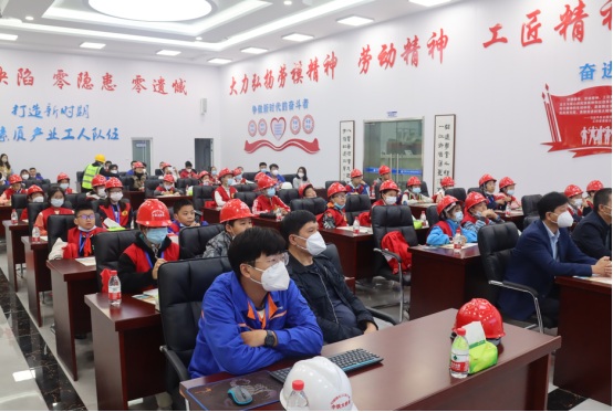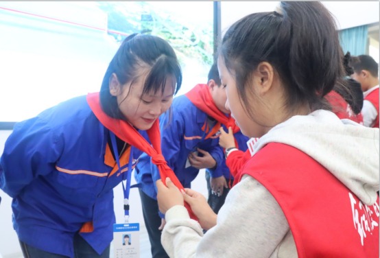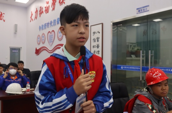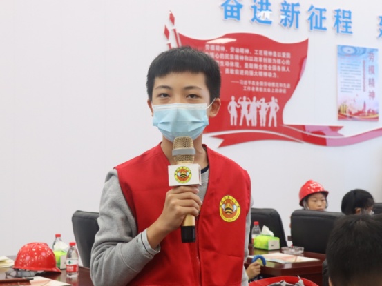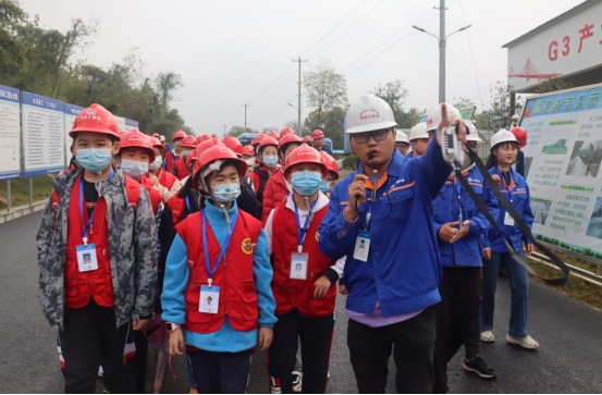 參觀結(jié)束后,小記者們來(lái)到展演廳,一起觀看G3橋建設(shè)宣傳片、聆聽(tīng)G3橋安全總監(jiān)周啟輝講解生物多樣性相關(guān)知識(shí)以及G3橋建設(shè)期間對(duì)生物多樣性保護(hù)的措施。一張張?zhí)匦Ю瓭M的動(dòng)態(tài)效果圖,一幀幀凝聚著建筑工人汗水的畫(huà)面,給小記者們留下了深刻的印象。小記者代表們?yōu)榻ㄔO(shè)者們戴上鮮紅的紅領(lǐng)巾,表達(dá)對(duì)他們的崇敬之情。