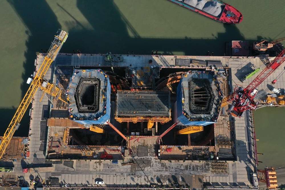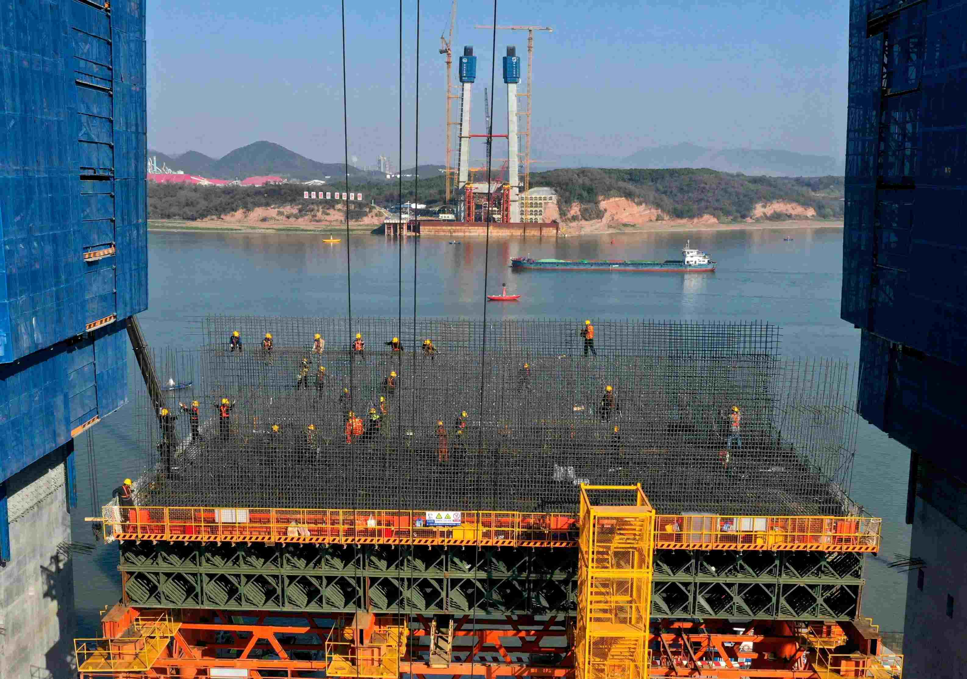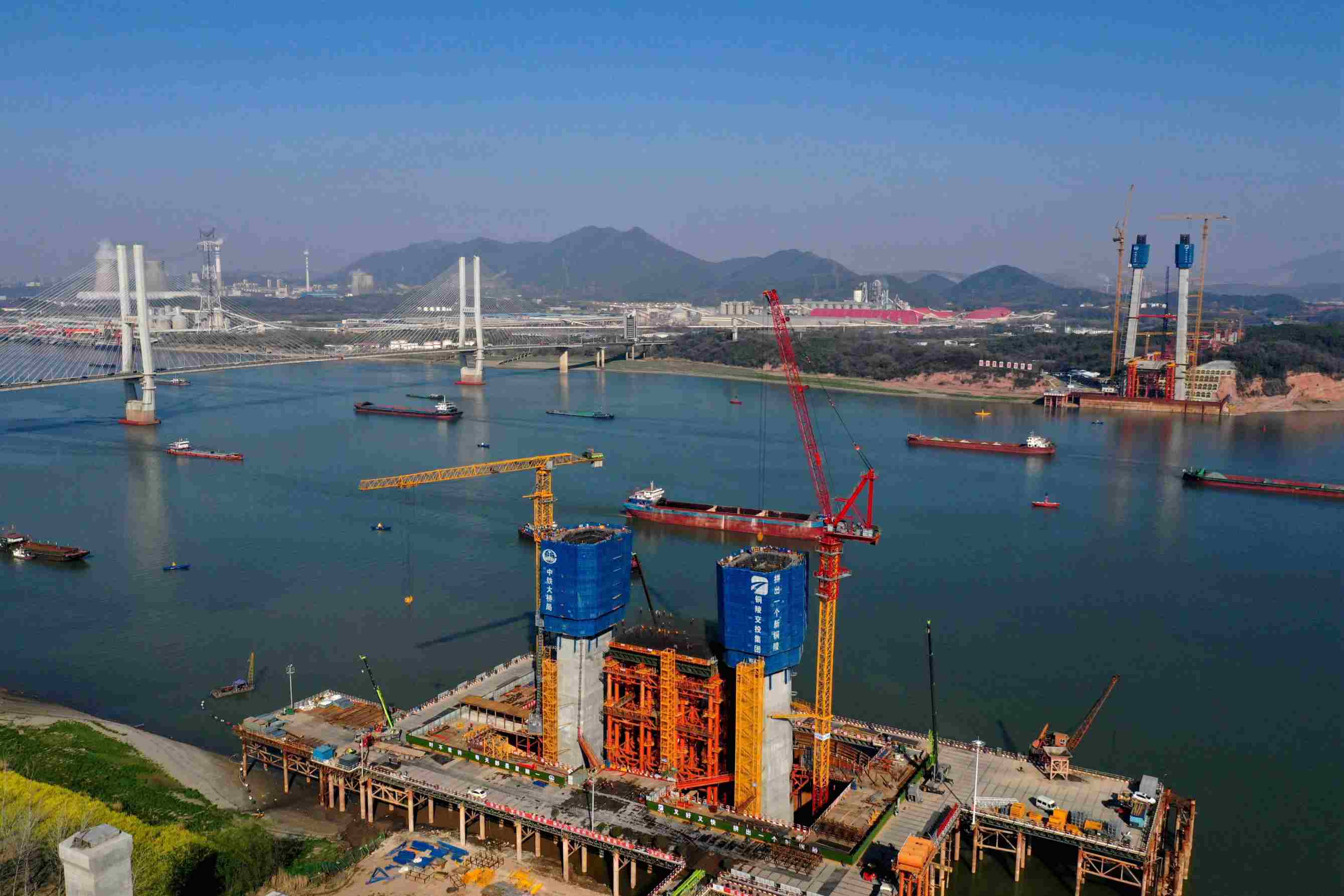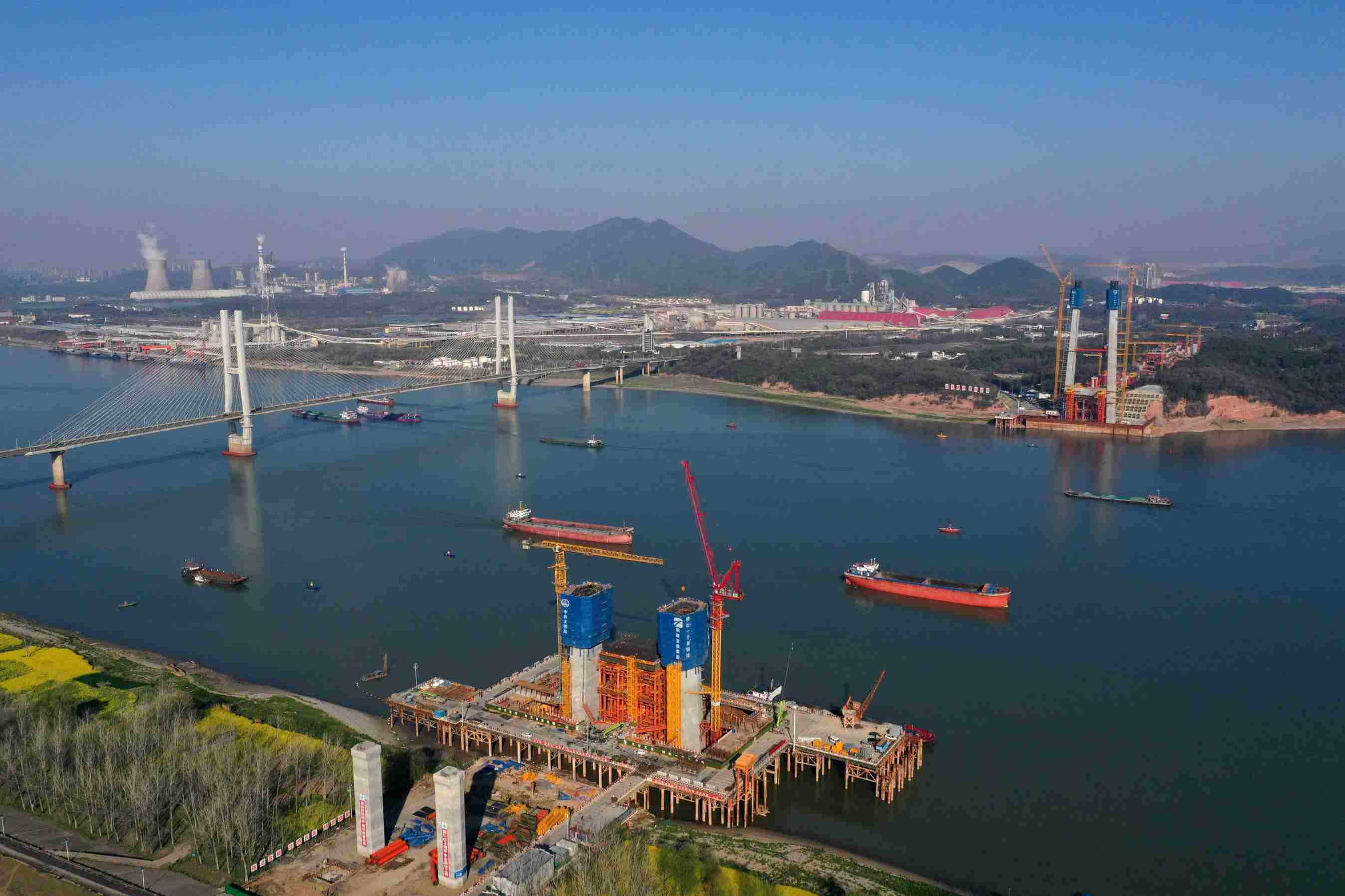 2023年3月13日,中鐵大橋局施工人員在G3(京臺(tái)高速)銅陵長江公鐵大橋進(jìn)行3號(hào)主墩塔柱施工