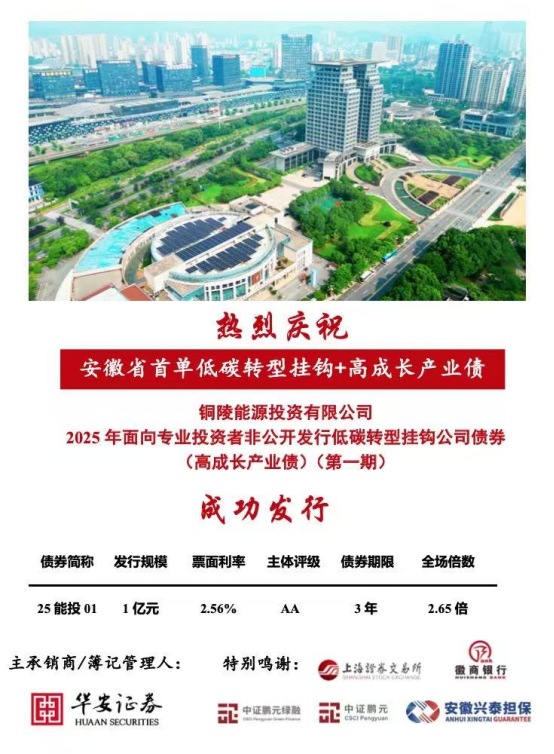 12月19日,銅陵市能源投資有限公司(以下簡稱“銅陵能投公司”)在上海證券交易所成功發(fā)行2025年第一期低碳轉(zhuǎn)型掛鉤公司債券“25能投01”。本次發(fā)行是安徽省首單低碳轉(zhuǎn)型掛鉤公司債+高成長產(chǎn)業(yè)債,也是銅陵能投公司在資本市場的首次亮相,額度3億元,本期發(fā)行1億元。期限3年,票面利率2.56%,全場認購倍數(shù)2.65倍。債券票面利率較1年期貸款市場報價利率3.0%下降44個基點,綜合節(jié)約融資成本約132萬元,標志著銅陵能投公司成功將金融創(chuàng)新、綠色發(fā)展以及產(chǎn)業(yè)轉(zhuǎn)型深度融合,獲得債券市場投資者的踴躍認購。