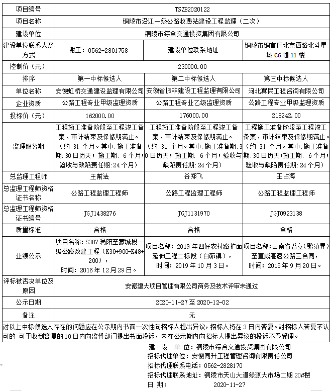 附件:銅陵市沿江一級公路收費站建設工程監(jiān)理二次中標候選人公示.doc:下載