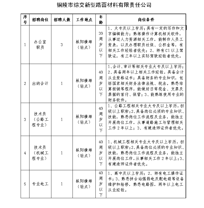 因業(yè)務發(fā)展需要,我公司司屬公司銅陵市綜交新型路面材料有限責任公司、銅陵交投再生資源綜合利用有限公司現(xiàn)面向社會公開招聘若干名工作人員,具體事項公告如下: