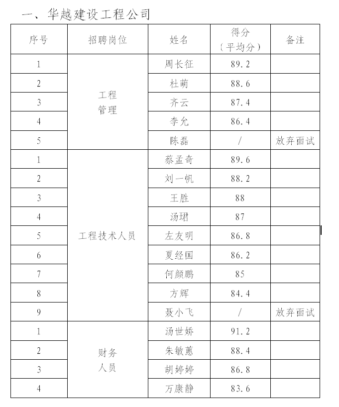 根據(jù)《銅陵華越建設(shè)工程有限公司公開(kāi)招聘人員公告》、《銅陵市華信工程質(zhì)量檢驗(yàn)有限責(zé)任公司公開(kāi)招聘人員公告》,于3月1日開(kāi)展招聘人員面試工作,現(xiàn)將擬招錄人員公示如下: