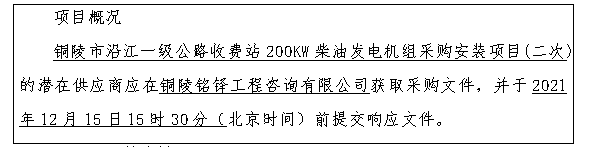 項(xiàng)目名稱:銅陵市沿江一級(jí)公路收費(fèi)站200KW柴油發(fā)電機(jī)組采購(gòu)安裝項(xiàng)目(二次)