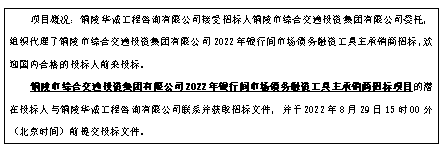 5.招標(biāo)需求:銅陵市綜合交通投資集團(tuán)有限公司通過(guò)公開(kāi)招標(biāo)形式選擇2022年銀行間市場(chǎng)債務(wù)融資工具主承銷(xiāo)商。本次發(fā)行的中期票據(jù)規(guī)模約為10億元,期限為3年,承銷(xiāo)商的主要服務(wù)內(nèi)容包括本次中期票據(jù)的發(fā)行方案編制、注冊(cè)、報(bào)批、后續(xù)的發(fā)行承銷(xiāo)、備案工作及本息的代理兌付等工作。