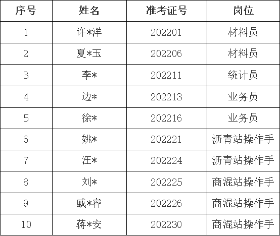 根據(jù)2022年9月29日發(fā)布的《銅陵市綜交新型路面材料有限責(zé)任公司招聘工作人員公告》的規(guī)定,現(xiàn)對(duì)擬錄用人員進(jìn)行公示,名單如下: