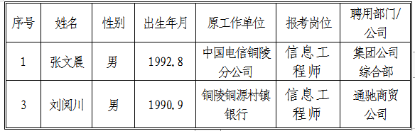 根據(jù)《銅陵市交通投資有限責任公司招聘人員公告》,現(xiàn)將信息工程師擬聘用人員名單公示如下: