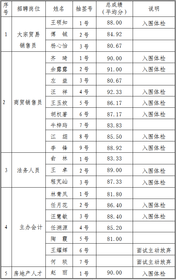 因公司經(jīng)營業(yè)務(wù)發(fā)展需要,根據(jù)應(yīng)聘者現(xiàn)場面試綜合能力表現(xiàn)情況,結(jié)合公司儲備人才需求,經(jīng)集團公司黨工委會議研究決定,現(xiàn)將交投集團公司商貿(mào)銷售員等崗位招聘情況公示如下: