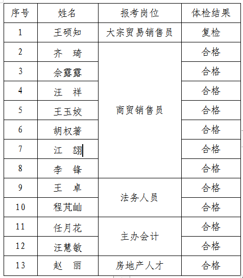 根據(jù)《銅陵市綜合交通投資集團(tuán)有限公司招聘人員公告》,集團(tuán)公司綜合部于2020年4月8日組織相關(guān)崗位入圍報考者參加體檢,現(xiàn)將相關(guān)體檢結(jié)果向社會進(jìn)行公示: