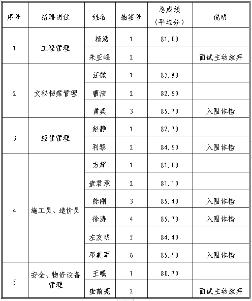 根據(jù)應聘者現(xiàn)場面試綜合能力表現(xiàn)情況,結合公司儲備人才需求,經公司研究決定,現(xiàn)將招聘情況公示如下: