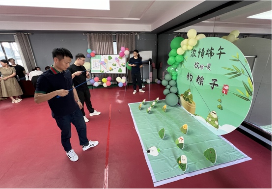 在游戲活動現(xiàn)場,充滿節(jié)日氣氛的裝飾映入眼簾,彩色的氣球、精美的展板,還有各式花樣的粽子、釣竿等道具,職工們紛紛揮動釣竿,試圖將掛有粽子的釣線準確地投入預設(shè)的“粽子池”中。一時間,現(xiàn)場歡聲笑語、熱鬧非凡。